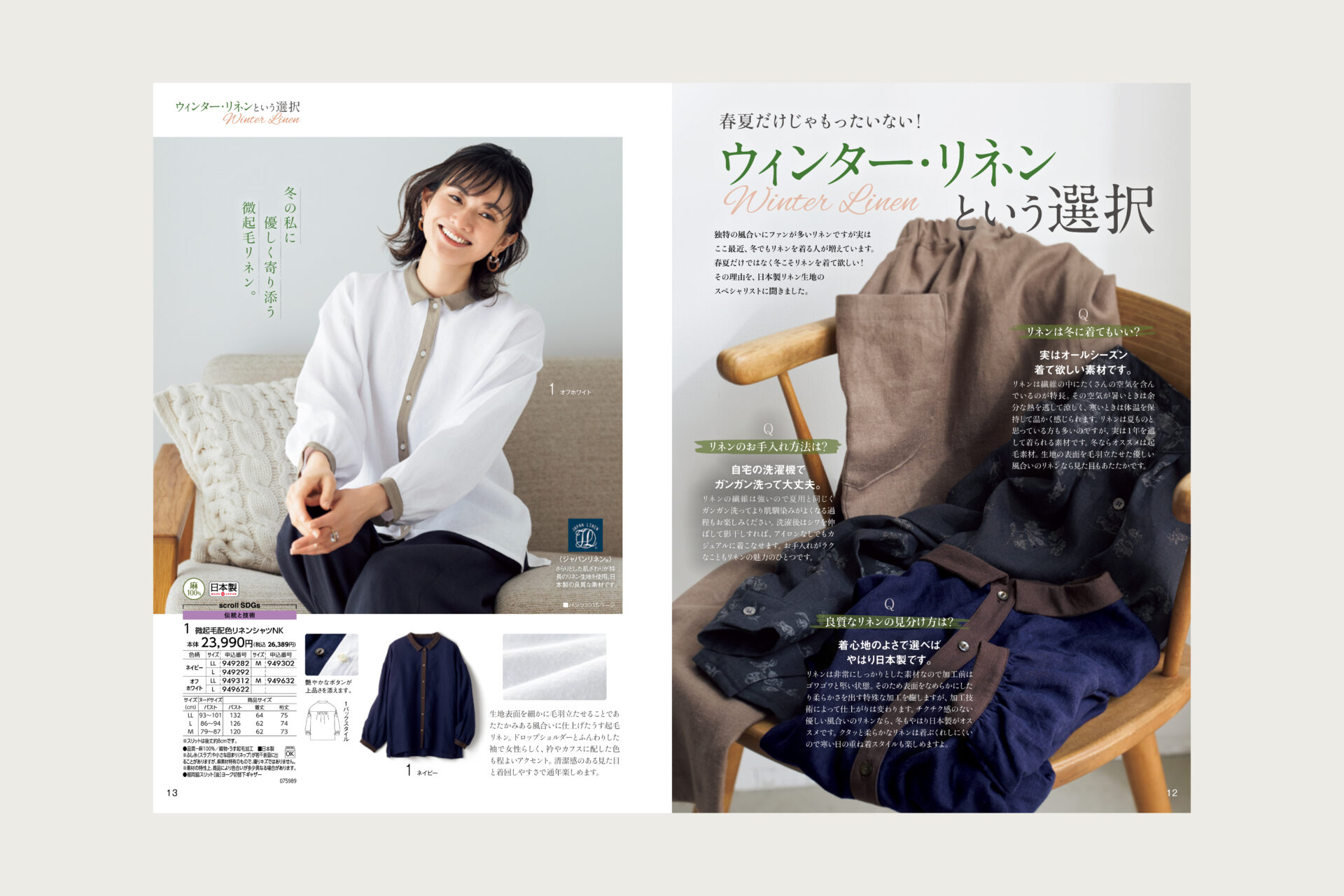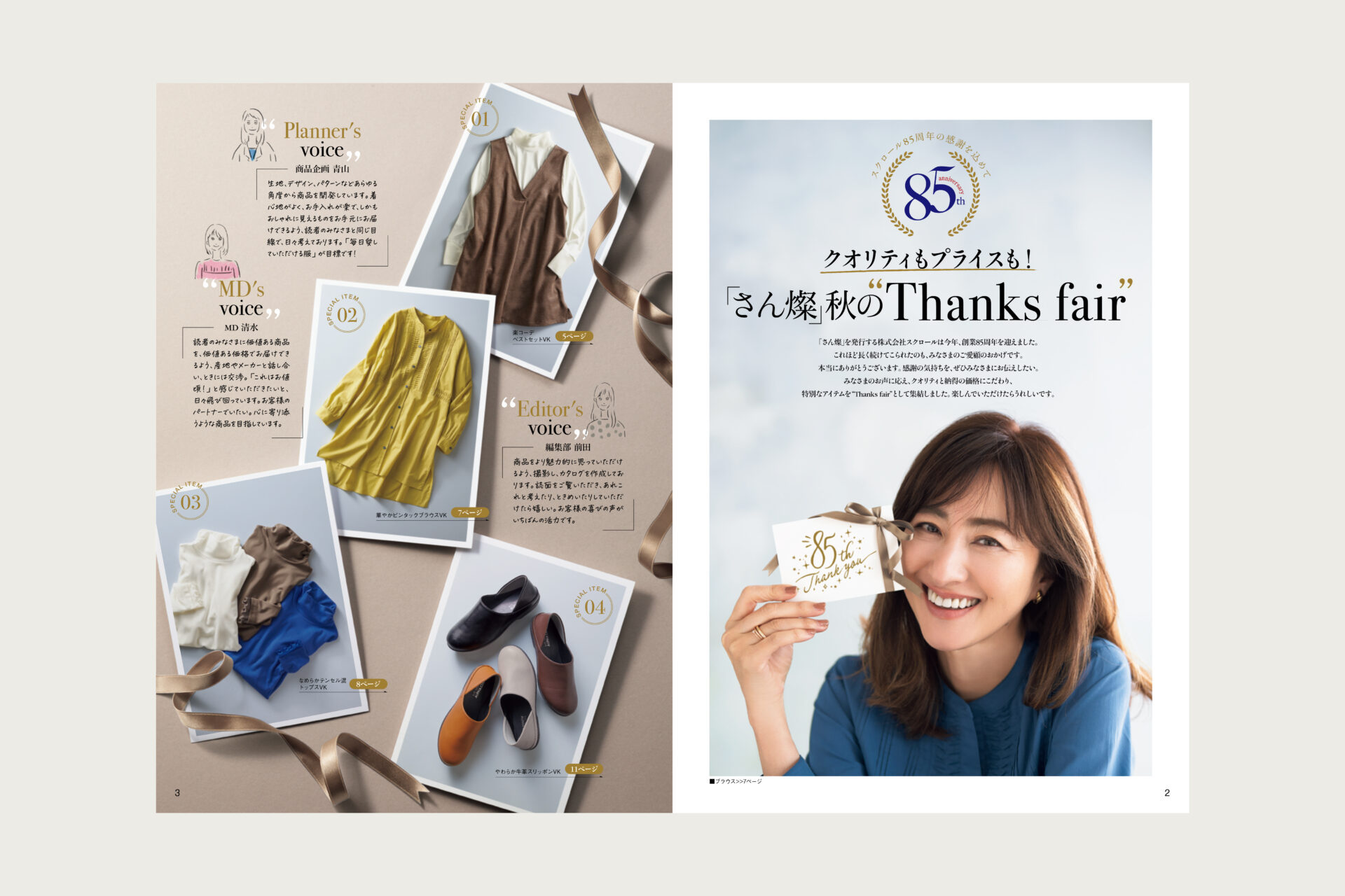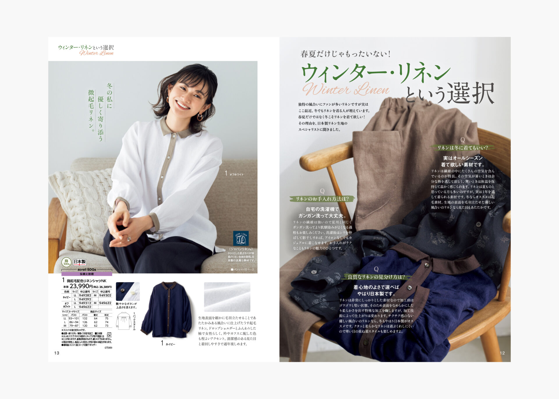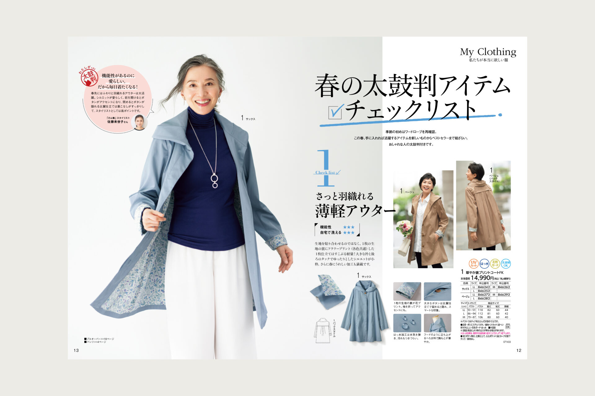 生協会員向けアパレル通販誌「さん燦」2024年春号から真冬号の企画・編集・撮影・デザインをトータルで担当。毎号季節感と暮らしに寄り添う特集を提案。さらに購買導線を意識した誌面設計と、トレンドを取り入れたビジュアル表現を行いました。その結果、読者に“読み物として楽しめる通販誌”としても認知され、購買意欲を高める役割を果たしました。
