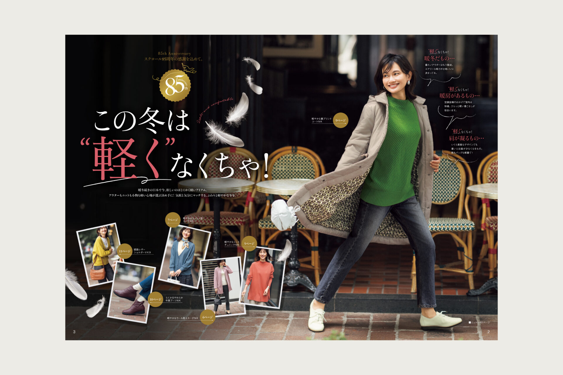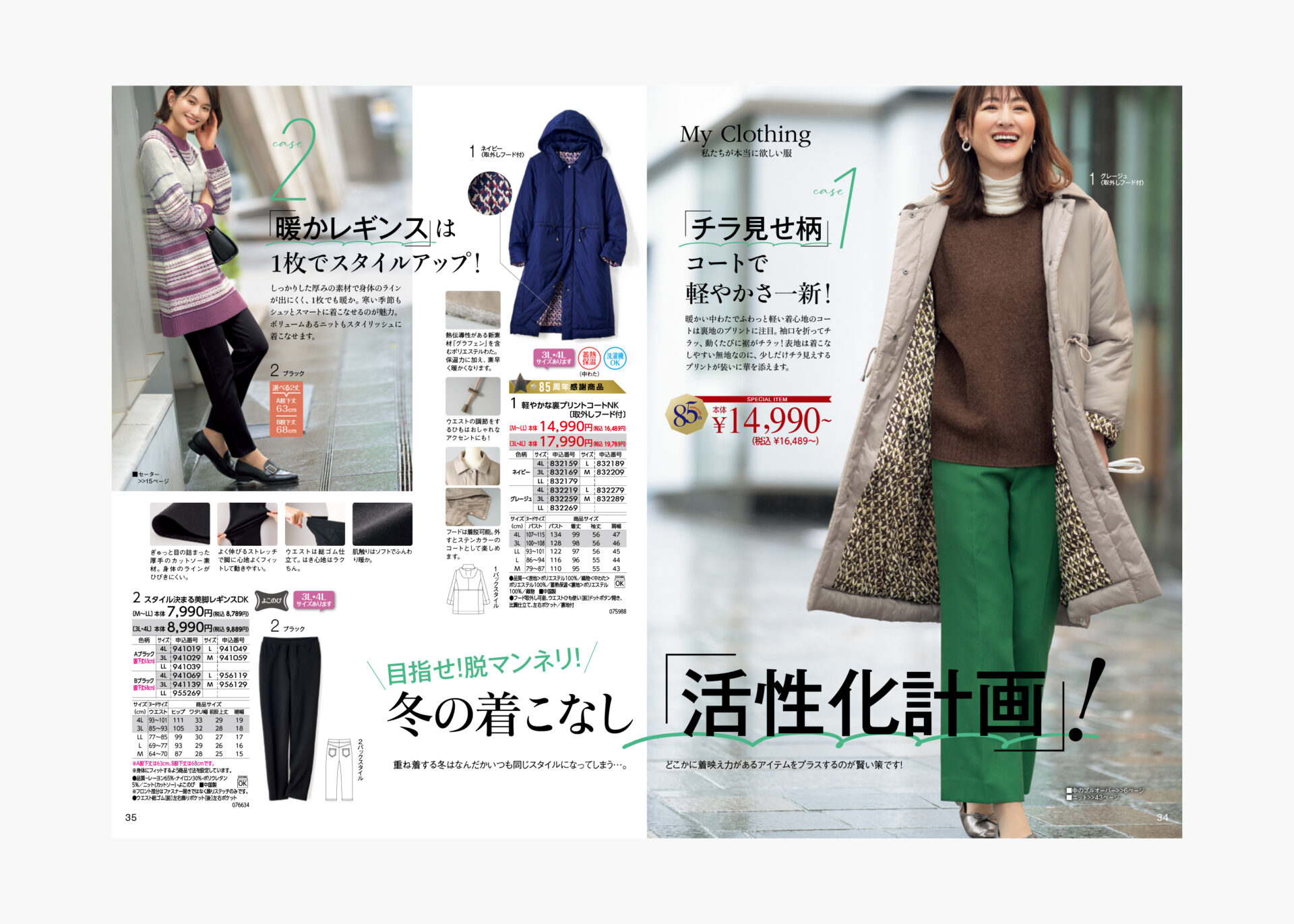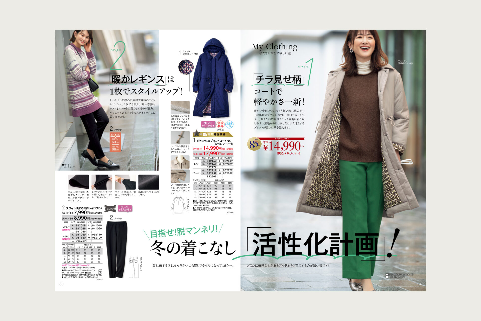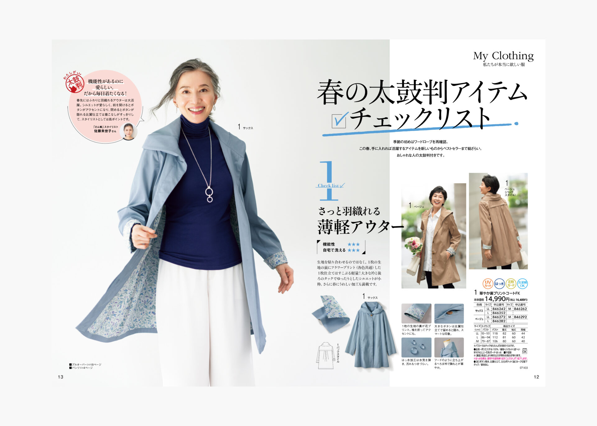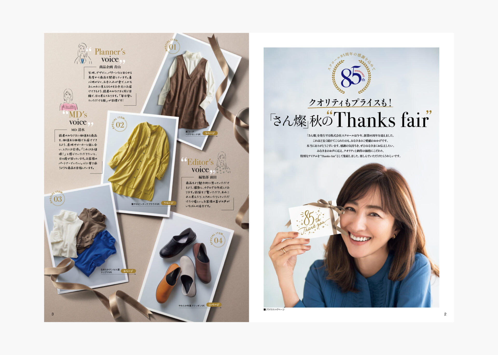 生協会員向けアパレル通販誌「さん燦」2024年春号から真冬号の企画・編集・撮影・デザインをトータルで担当。毎号季節感と暮らしに寄り添う特集を提案。さらに購買導線を意識した誌面設計と、トレンドを取り入れたビジュアル表現を行いました。その結果、読者に“読み物として楽しめる通販誌”としても認知され、購買意欲を高める役割を果たしました。