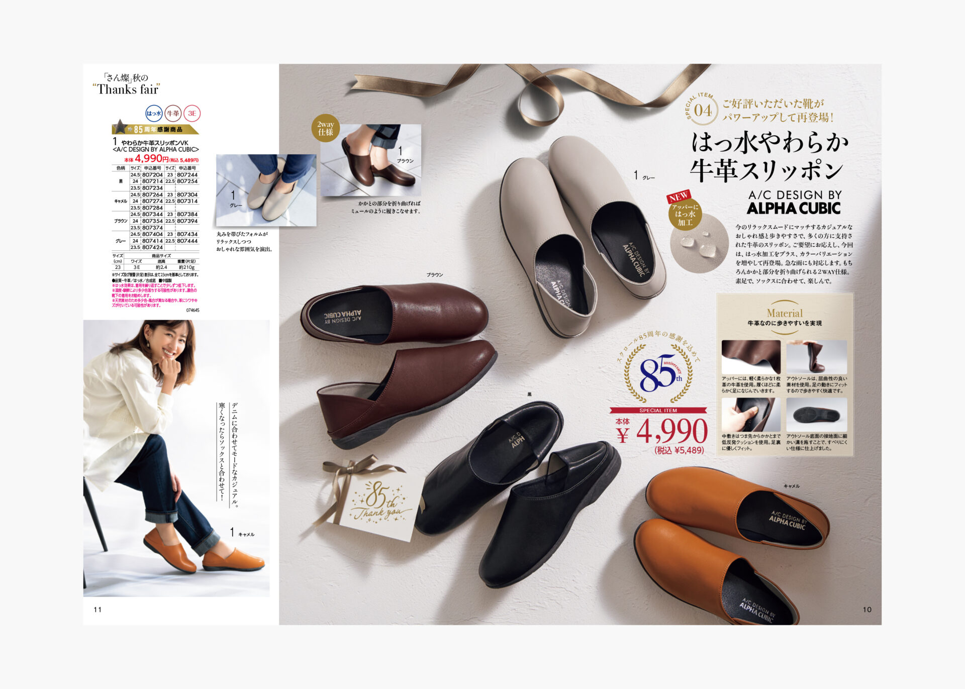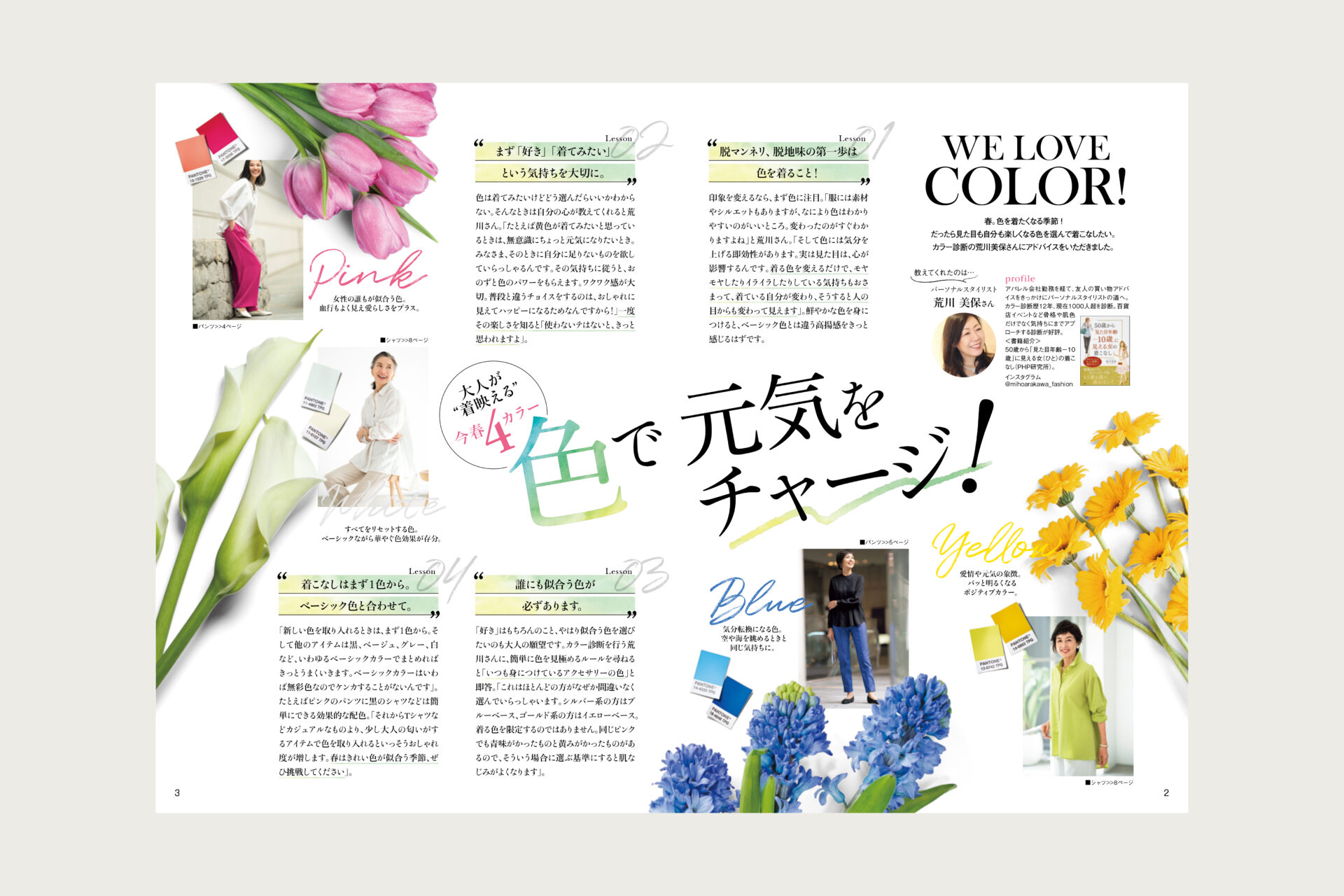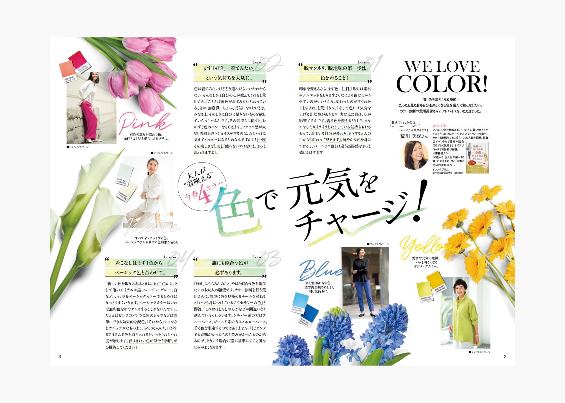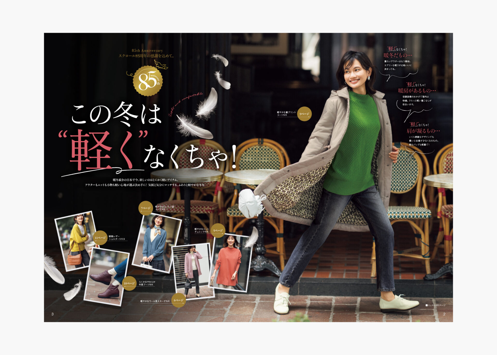生協会員向けアパレル通販誌「さん燦」2024年春号から真冬号の企画・編集・撮影・デザインをトータルで担当。毎号季節感と暮らしに寄り添う特集を提案。さらに購買導線を意識した誌面設計と、トレンドを取り入れたビジュアル表現を行いました。その結果、読者に“読み物として楽しめる通販誌”としても認知され、購買意欲を高める役割を果たしました。
