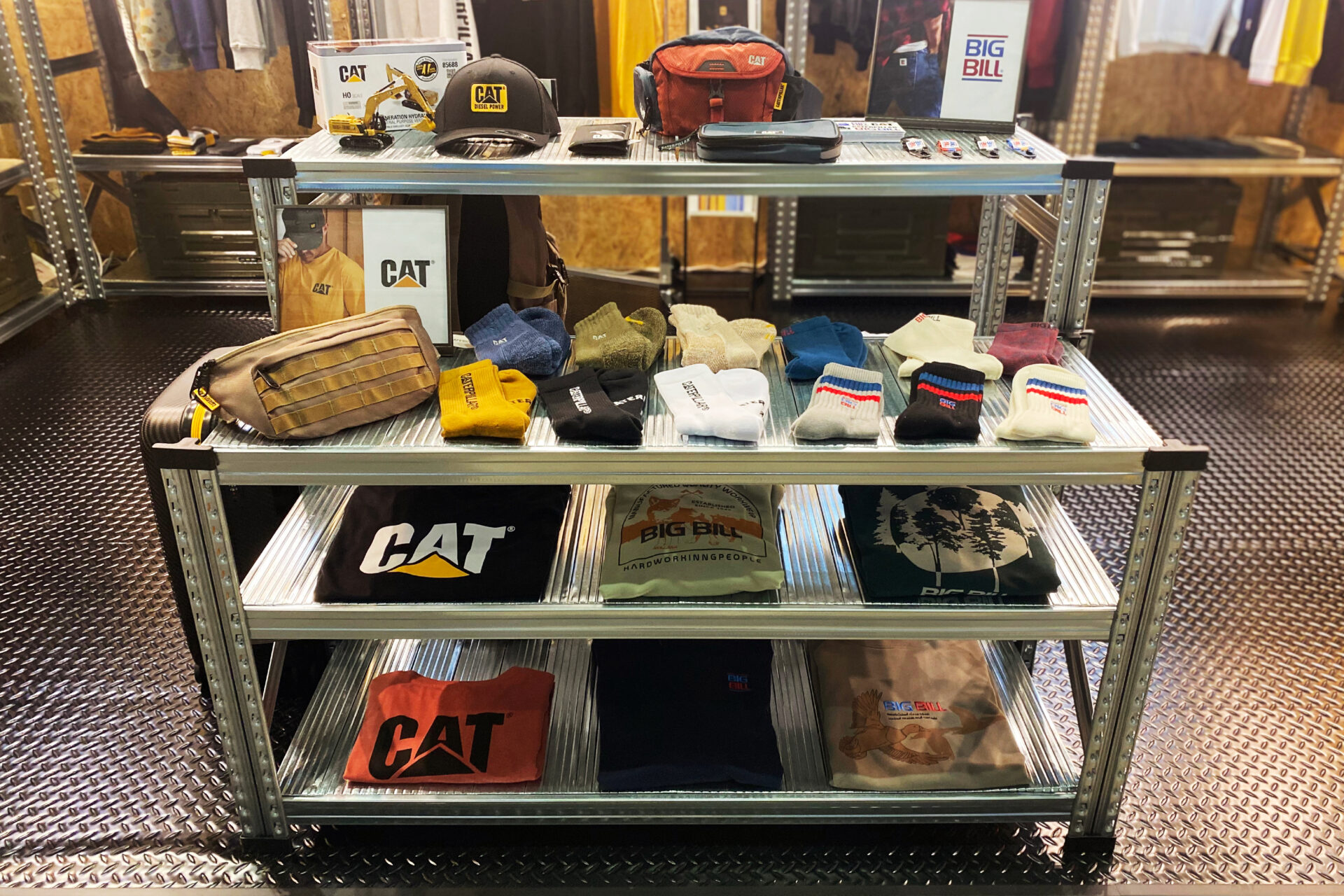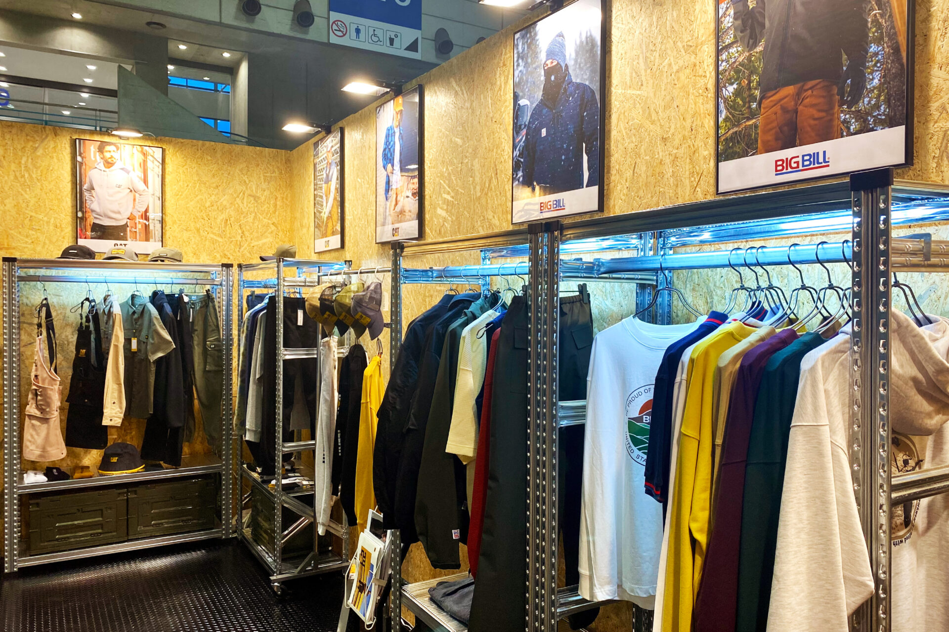 OSB合板の壁面と縞鋼板風の床、メタル什器でDIY/ガレージ感のある演出