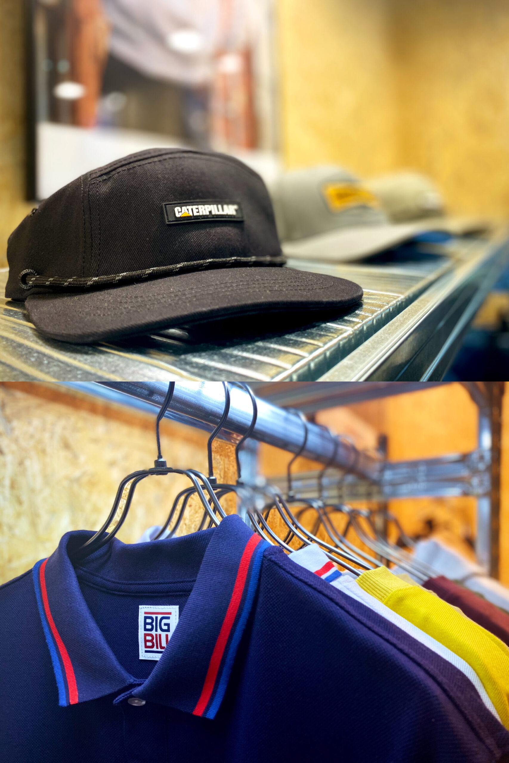 OSB合板の壁面と縞鋼板風の床、メタル什器でDIY/ガレージ感のある演出