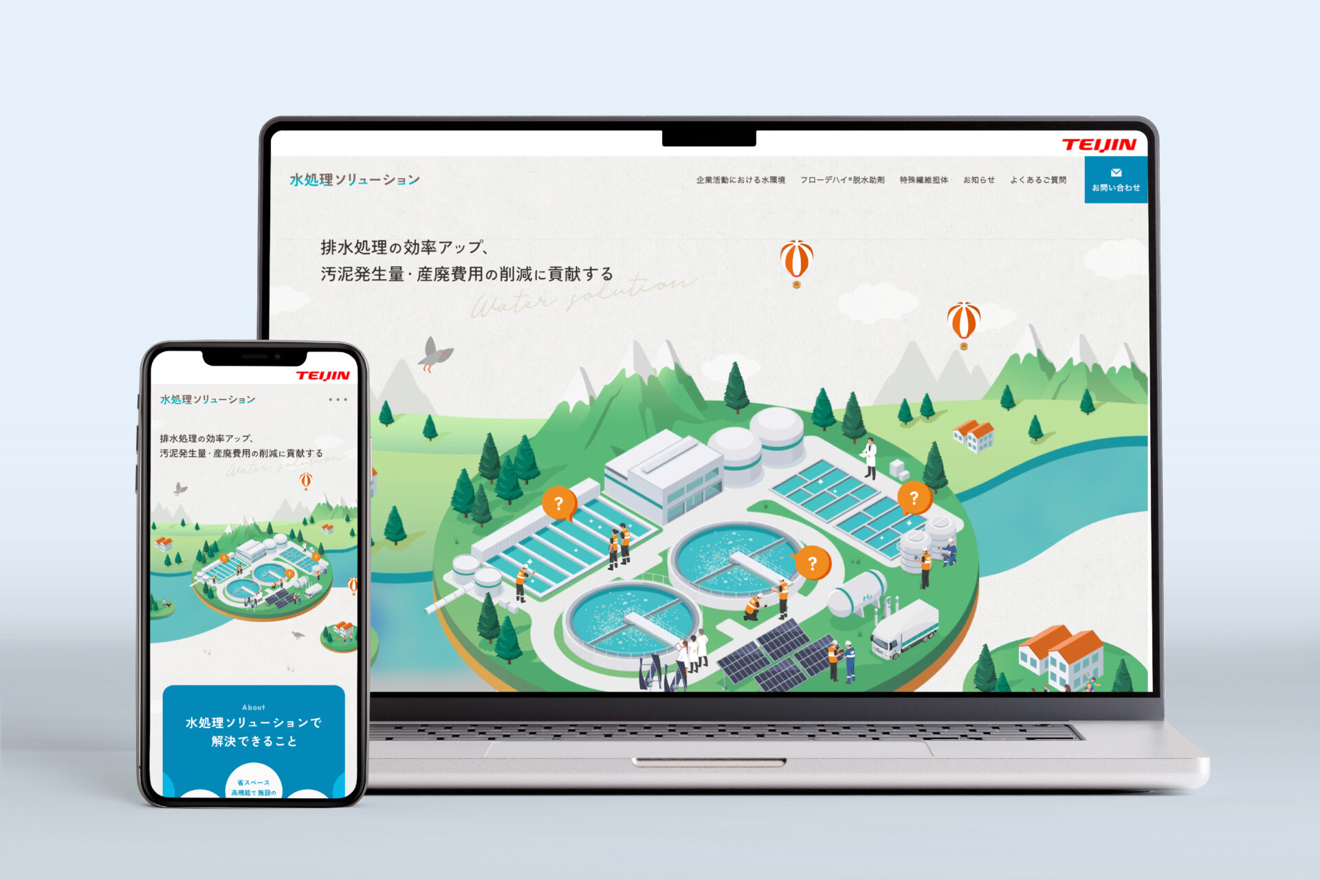 水処理事業の強化に向け、専用WEBサイトの開発と下水道展2024での展示会サポートを実施。WEBはBtoB広報の受け皿として機能し、展示会も同一デザインコンセプトで展開することで、統一感あるブランド表現を実現しました。オンラインとリアルをシームレスに連動させることで、効率的なリード獲得と事業拡販を後押ししています。