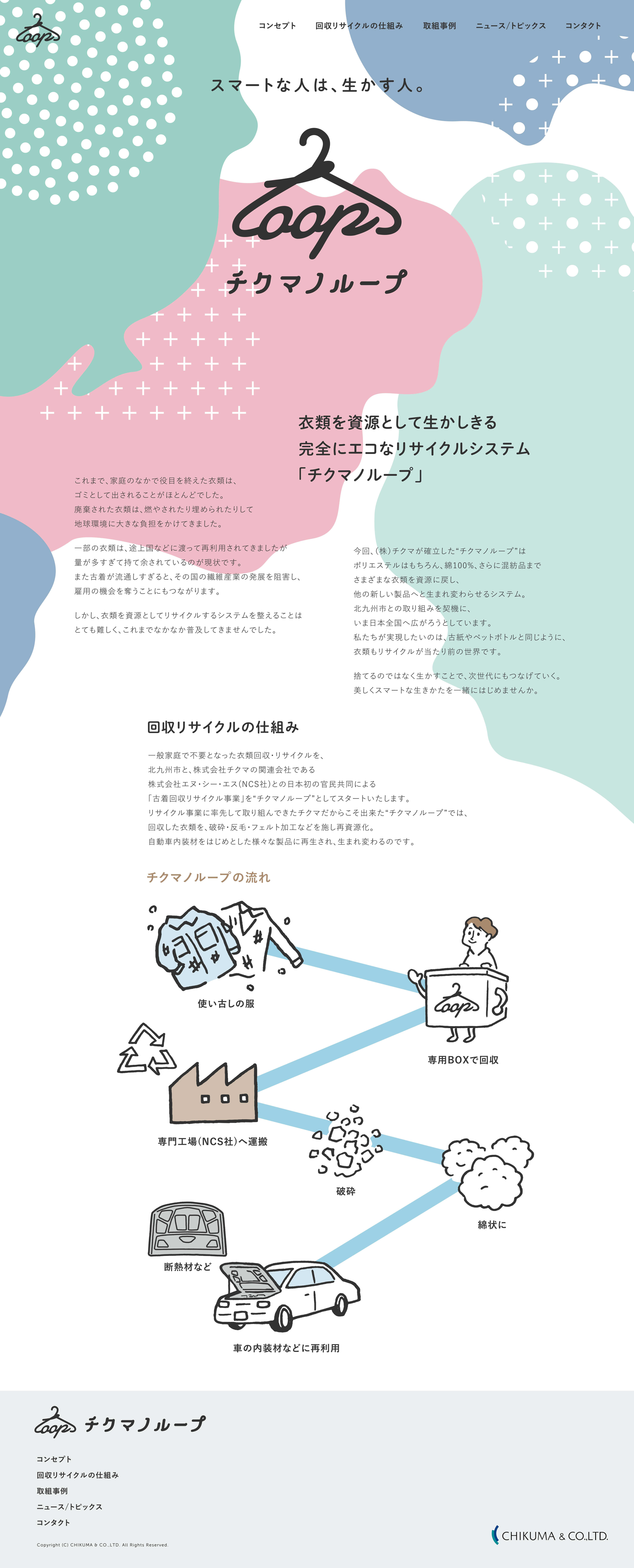 ポリエステル回収リサイクルスキーム「チクマノループ」のブランド化を担当。背景には、仕組み自体が複雑で社外に伝わりにくい課題があった。解決策として、ネーミングやストーリー開発、キービジュアル、Webサイトを制作し、仕組みを見える化。結果、リサイクルプロセスの理解が深まり、大手企業との協業拡大につながるブランド基盤を構築した。